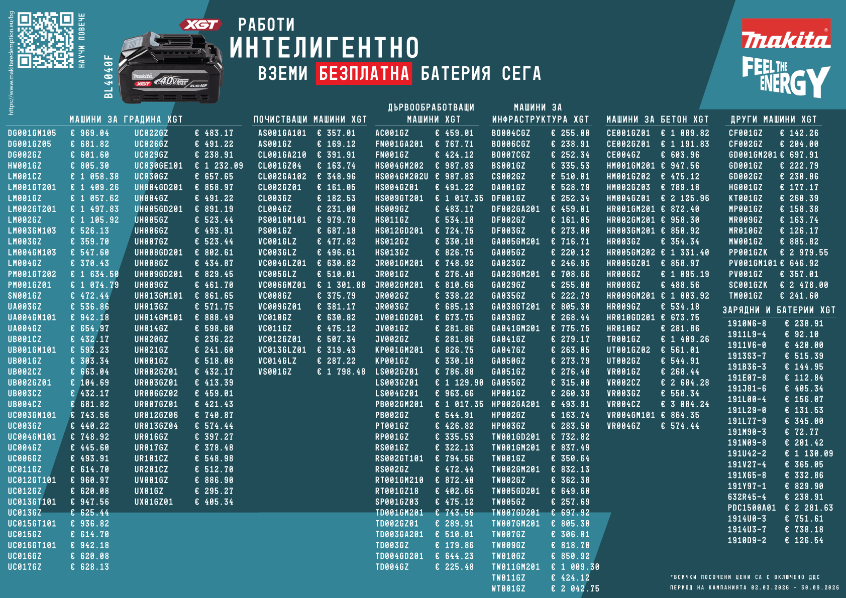 ✅ При всяка покупка на стойност € 450 без ДДС от посочените промоционални модели, получавате 1бр. подарък батерия BL4040F. (Пример: € 450 без ДДС - 1 батерия; € 900 без ДДС - 2 батерии и т.н.)